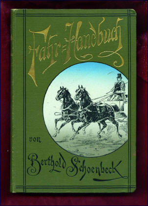 Schoenbeck, Berthold: Fahr-Handbuch zum Selbststudium für alle Freunde des Fahrsports, Equipagenbesitzer, Kutscher und Fahrer jeden Standes nebst Anleitung zur Beurteilung, Pflege und Wartung des Pferdes im gesunden und kranken Zustande. Leipzig (Verlag Hartung & Sohn) 1895. (= zweite, verbesserte Auflage). 8°, XVI, 308 Seiten. Mit "161 Illustrations-Tafeln und Text-Abbildungen". Goldgeprägtes Original-Leinen mit hübscher farbiger Deckelillustration.