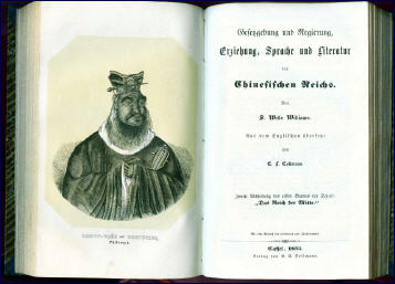 S(amuel). Wells Williams, Das Reich der Mitte. Eine Uebersicht der Geographie, Statistik, Naturgeschichte, Gesetzgebung und Regierung, der Erziehung, der Sprache und Literatur, des socialen Lebens, der Künste, der Religion etc. des Chinesischen Reichs und seiner Bewohner. Aus dem Englischen übersetzt von C. L. Collmann. 2 Teile in einem Band. Kassel (Verlag G. E. Bollmann). 8°. XIV, 292 Seiten, Zwischentitel S. 293 -612. Mit zwei getönten lithographischen Frontispizes, einem getönten lithographischen Titelblatt, zwei Tafeln, Textillustrationen sowie einer mehrfach gefalteten, lithogr. Karte von China. Etwas späteres Halbkaliko mit Rückengoldprägung (etwas berieben). Verso Drucktitel der Stempel der Hofbibliothek Donaueschingen.