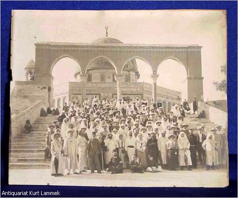 Ein Foto, 23,5 x 29 cm, auf Pappe montiert, verso auf der Pappe von alter Hand bezeichnet: "Bayerische Pilger vor der Omar-Moschee. Jerusalem 4. August 1904". Das Foto mit kleinen Randläsuren, links oben im Himmel ein kleines Loch, die Trägerpappe mit Montagespuren und Wurmlöchern.