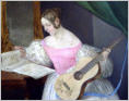 Eine Gitarrenspielerin, in Noten blätternd. Anonymes Gemälde, um 1800. Öl auf Holz, 30 x 24,7 cm. In altem Holzrahmen.